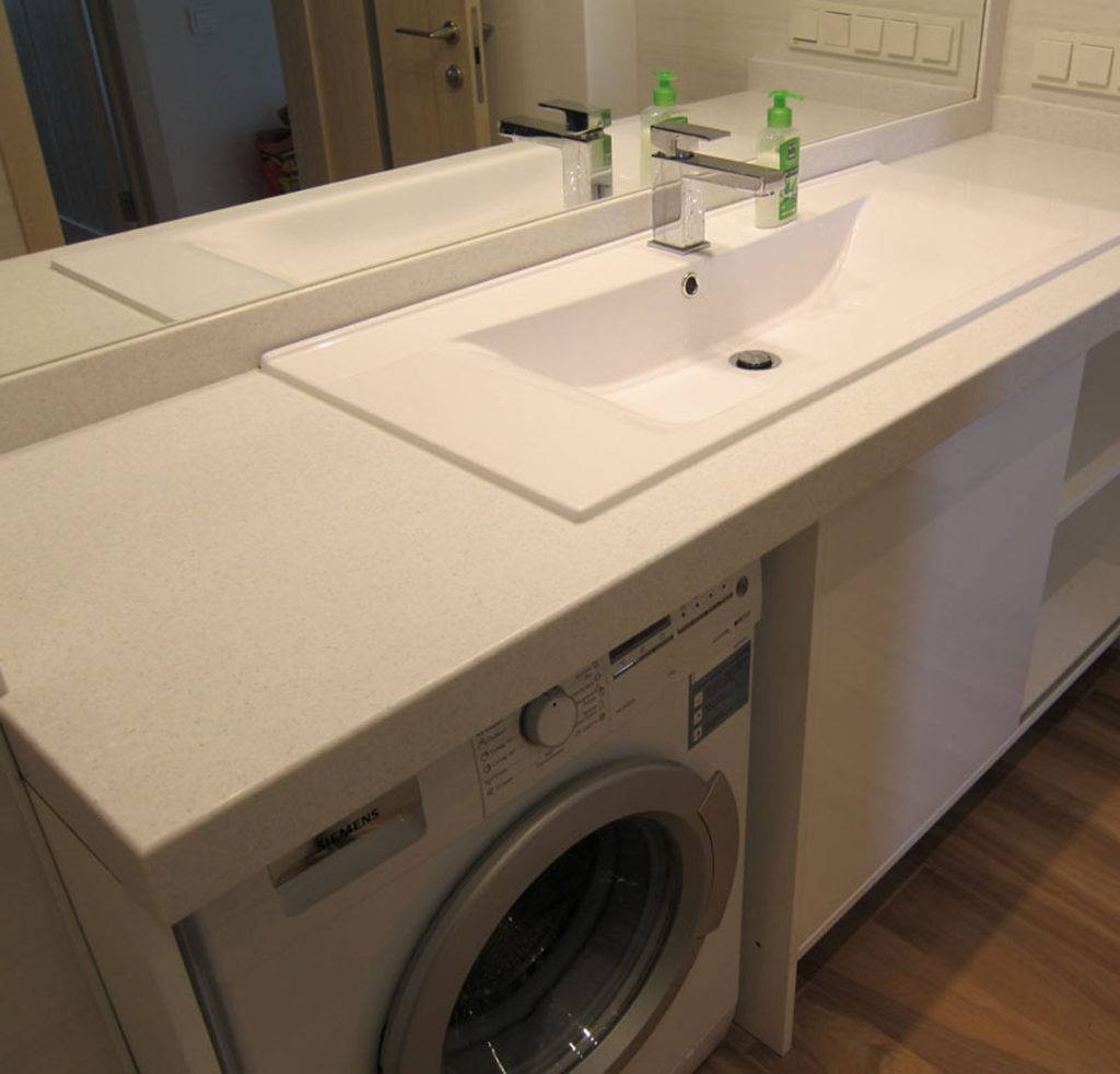 Если стена, вдоль которой вы планируете установить стиральную машину и раковину шире одного метра, рекомендуем вариант с длинной столешницей. Она может быть сделана из синтетического мрамора, массива дерева, МДФ, ДСП и ЛДСП. Искусственный камень и натуральное дерево — более дорогие варианты, МДФ, ДСП и ЛДСП — более бюджетные.