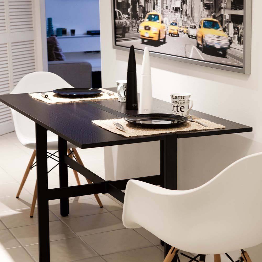 - Трансформирующийся стол имеет маленькие размеры в сложенном состоянии. Так удается снизить степень загруженности кухни.