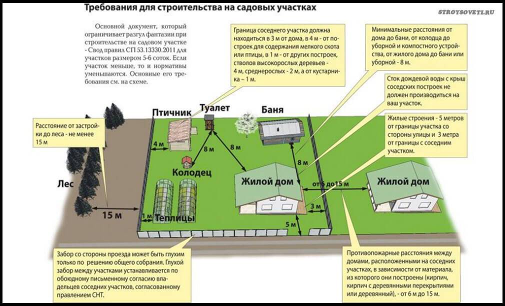 - Требуемая дистанция между разнотипными постройками на участке.