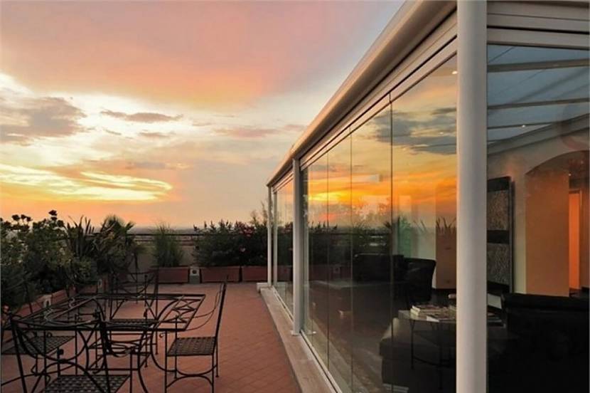 - Прочность и легкость створок не дает никакой значимой нагрузки на основу, поэтому конструкцию можно использовать для остекления террасы, находящейся на втором этаже.