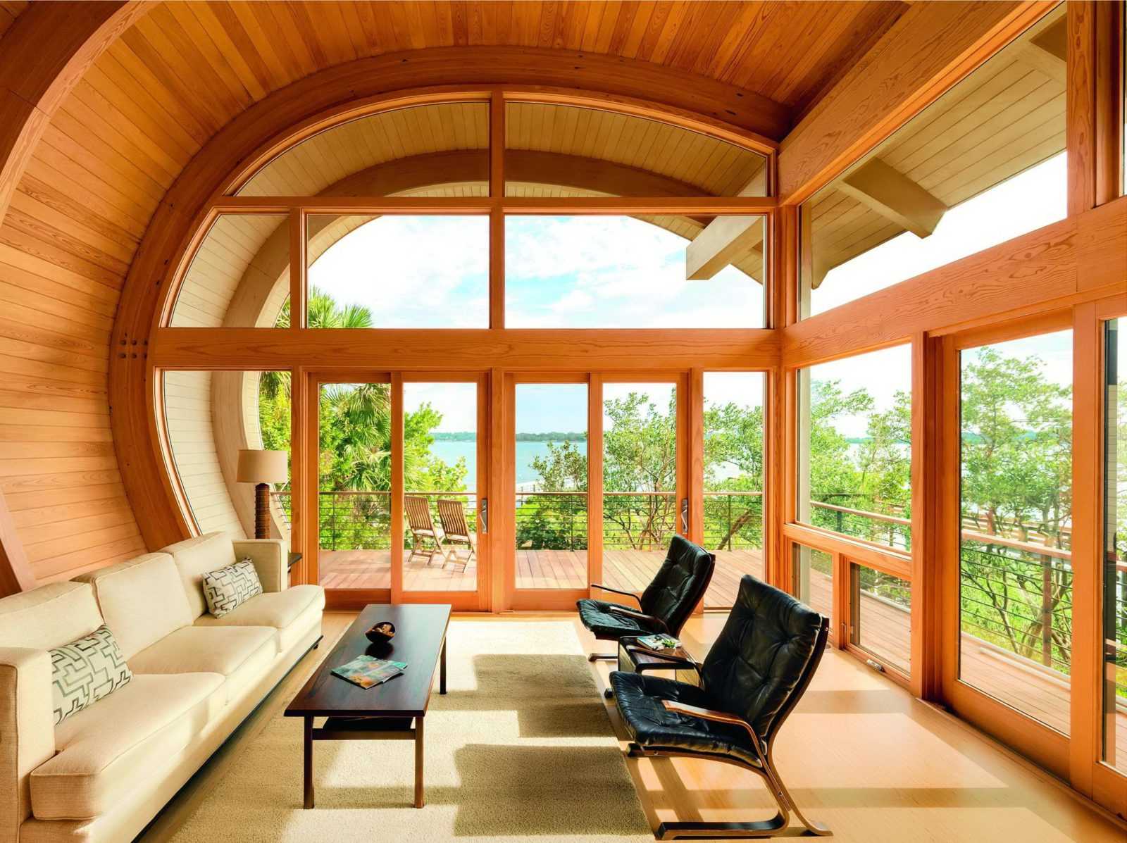 Дерево. Раньше для остекления домов (не только веранд) использовалась исключительно древесина. С появлением альтернативных вариантов об этом материале стали потихоньку забывать, но его достоинства от этого не померкли. Дерево обладает высокой шумо- и теплоизоляцией. Хотя, конечно, основной «удар» по сохранению тепла получает само стекло, от рам тоже многое зависит. В отличие от пластика или алюминия, древесине не нужны дополнительные термо-вкладыши, так как материал сам препятствует попаданию в помещение холода и выходу теплого воздуха наружу. В древесине имеются микропоры, что позволяет ей «дышать». Производители пластиковых стеклопакетов в характеристиках озвучивают предельный минус для материала в 30 градусов мороза. При этой температуре ПВХ теряет прочность и становится ломким.