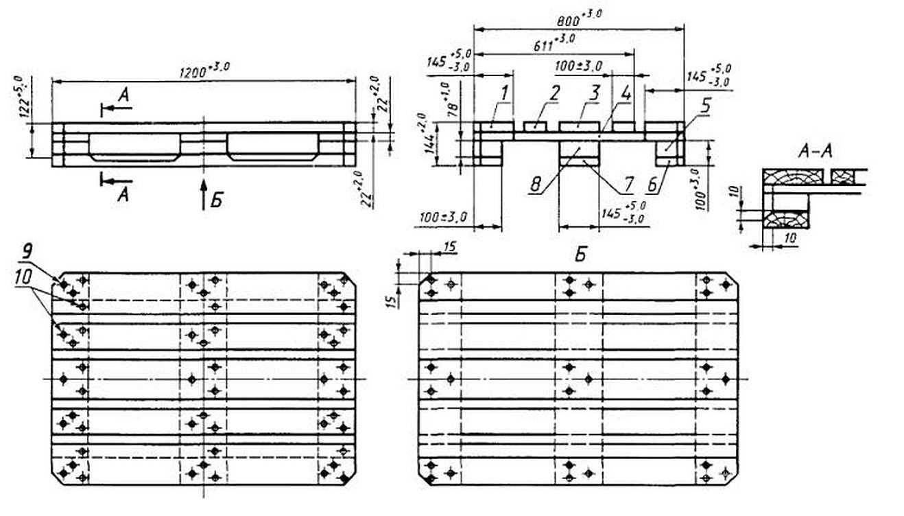 Части (доски) соединяются гвоздями. Стандарт для многоразовых изделий предусматривает: