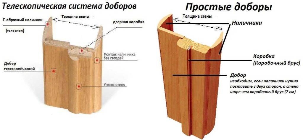 Доборные доски (планки) существуют двух типов – телескопические и обычные. Обычная доборная планка – просто деревянная доска, с обеих сторон обрезанная (с одной стороны упирается в короб, с другой – с наличником, если смотреть на двери в разрезе). Телескопическая – это короб со специальными пазами внутри для установки доборов или наличников. Телескопическая является наиболее удобным и долговечным вариантом, потому что крепеж будет меньше подвергаться механическому воздействию при установке и, как следствие, прослужит дольше обыкновенных доборных планок.
