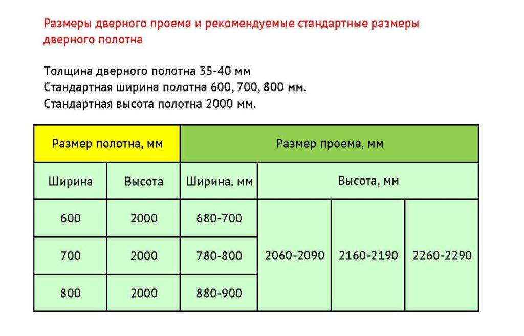 Стандартные размеры межкомнатной двери с коробкой представлены в таблице, причем в большинстве случаев указывают отдельно габариты полотна и проема:
