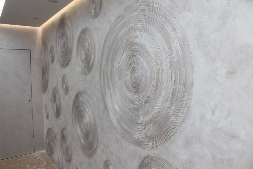 За счет протаскивания теркой по мокрому слою можно получить горизонтальные и вертикальные полосы. Также создаются круги или полукруги.