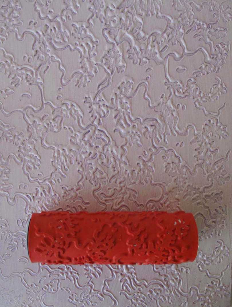 Валик. Не менее разнообразные возможности для формирования рисунков. В строительных магазинах продаются готовые насадки, которые остается надеть на валик и приступить к творчеству. Если хочется больше индивидуальности, то можно сделать насадку самому. Для этого подойдут самые простые материалы: нитки, веревка, мех, губка, полиэтилен, резинка и многое другое. Необходимо только проявить фантазию.