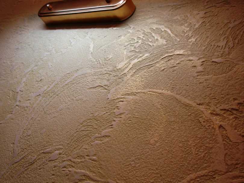 - фактурная поверхность – используется чаще всего, поскольку не требует особых умений. Этот способ подразумевает нанесение состава с помощью специальных инструментов (например, рельефного валика с узором, предназначенного для штукатурки) или подручных средств типа полиэтиленовой пленки, мочалки, шпателя. Можно даже сформировать узор руками;