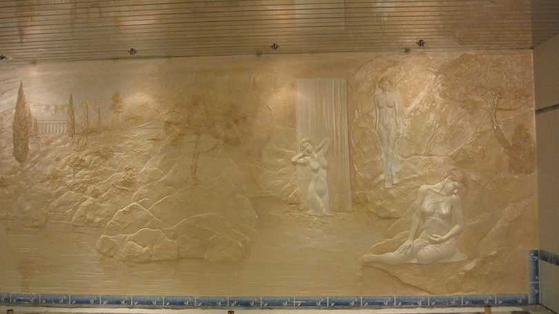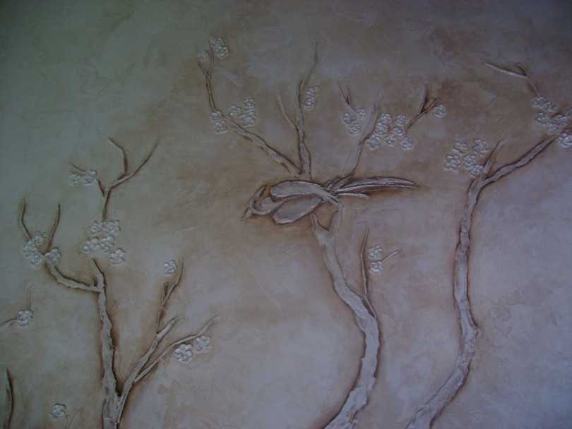 Помимо этого, можно создать игру объема. Делая акцент изображения в центральной части стены, а на объеме – на периферии, получается отличный эффект глубины и сказочности помещения. Такой прием, в некотором роде, перемещает человека в окружение, созданное штукатуркой.