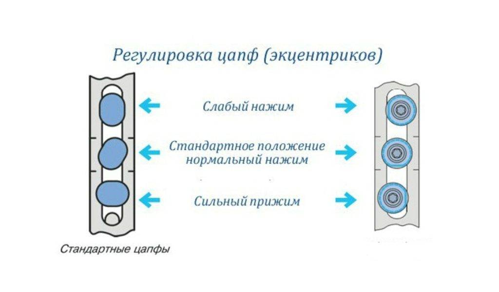 На срезе створки есть выступающие цилиндры немножко округлой формы, находящиеся в прорезях железных заглушек, и именуются цапфами (эксцентриками). На раме есть взаимные зацепы, в какие данные зацепы заходят при повороте ручки и створка жмётся к раме. Настройку старания можно сделать путем прокручивания эксцентриков или перемещения взаимных зацепов.