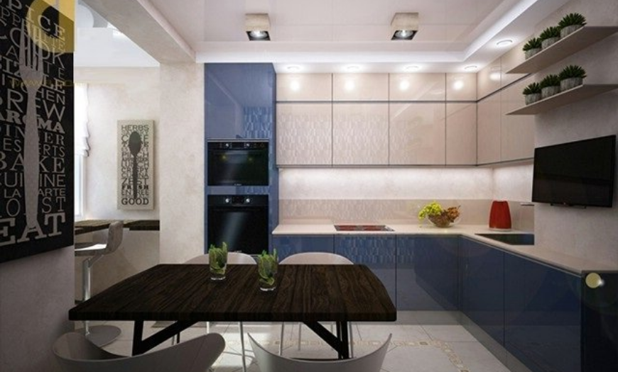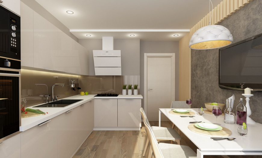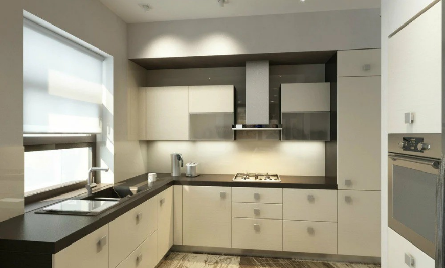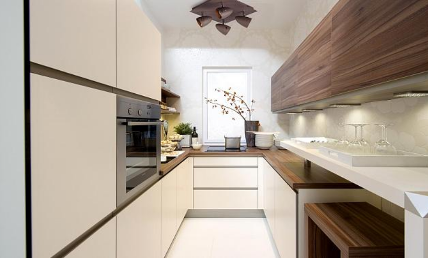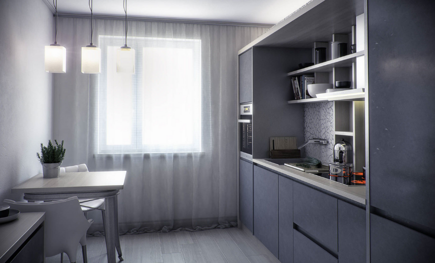 Небольшое помещение требует наиболее максимальной функциональности. Именно поэтому в дизайне применяют не слишком яркие цвета. Бытовую технику и посуду лучше всего спрятать за различными дверцами и фасадами. Великолепным решением является применение интересной монохромной расцветки.