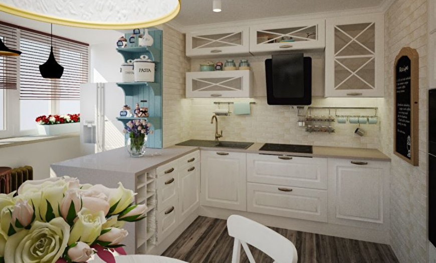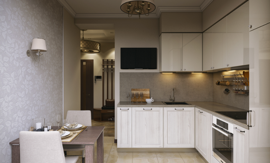 Классика — самое популярное стилевое направление для оформления интерьеров. Она придаёт помещению роскоши, уюта, предполагает плавные формы и нейтральные светлые тона в отделке и мебели. Это дорогой стиль, поскольку требует использования натуральных материалов, дорогого декора и соблюдения симметрии. Классика обычно выбирается для обустройства просторных помещений с высокими потолками. Но в кухне площадью 9 м² её можно обозначить некоторыми предметами мебели или декора.