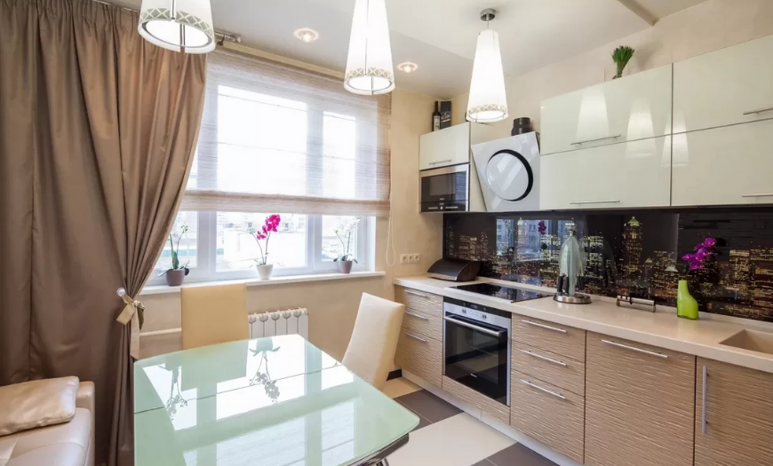 Холодильник и пенал ставят в начале и конце гарнитура, а мойку и плиту разделяют рабочей поверхностью, но это необязательно. Обеденный стол лучше выбирать круглый и с глянцевой поверхностью. Это позволит избежать травм от ударов об углы стола и делает интерьер более красивым.