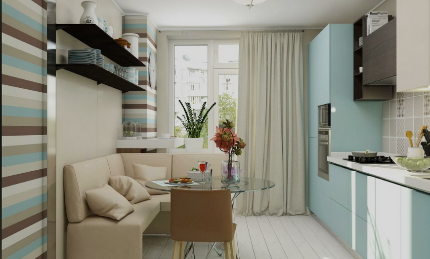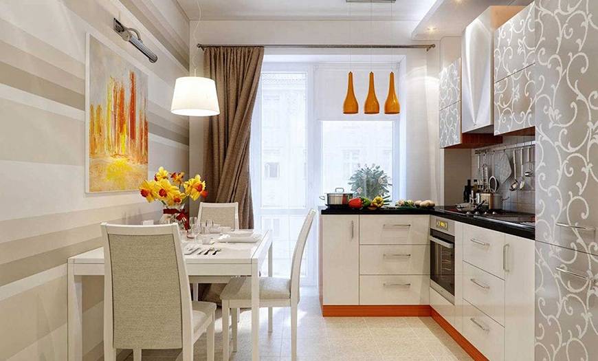 На фото — проект кухни площадью 9 кв. метров с отделкой стен в полоску.