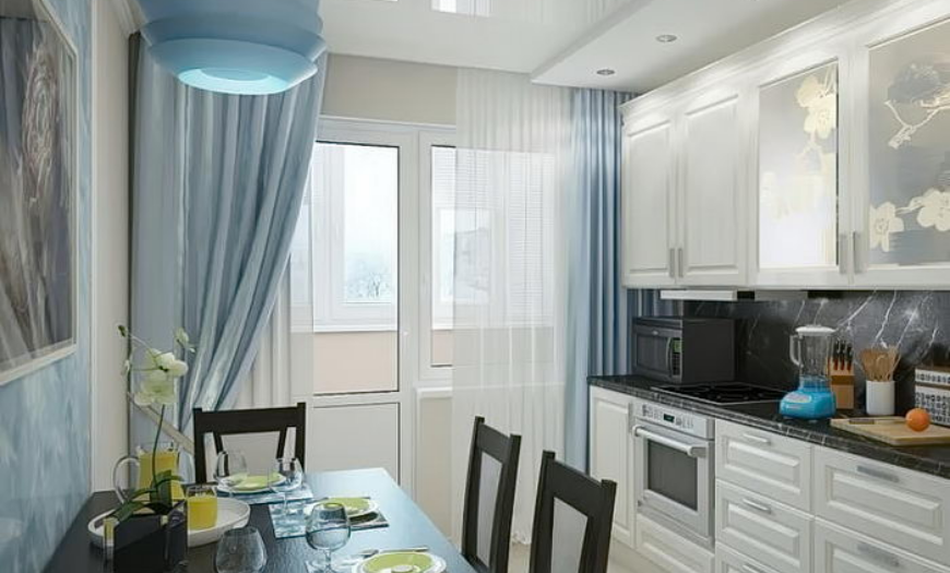 И последний совет по ремонту кухни площадью 9 кв. метров – оставьте дверной проем без двери, оформив его только наличниками или замените распашную дверь на раздвижную.