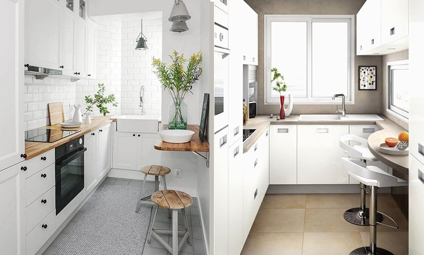 Увеличить кухню можно за счет оптической иллюзии — с помощью фотообоев с перспективным изображением на одной из стен.