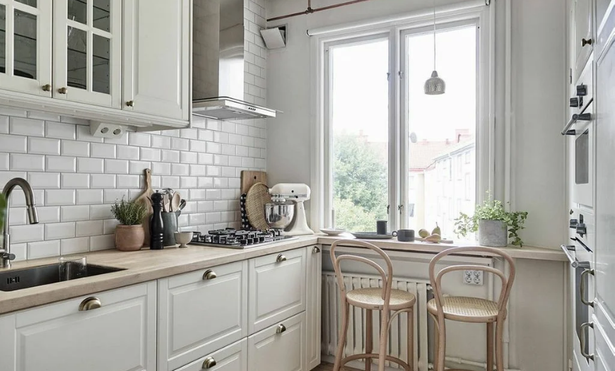 Скандинавский стиль является лидером, когда дело доходит до яркой внутренней отделки в ремонте. Прежде всего, на маленькой кухне стоит использовать цвета, которые визуально увеличат ее. Белый и другие светлые цвета обладают такими свойствами, поэтому белая кухня – отличное решение. Эффект можно усилить, выбрав глянцевые и светоотражающие материалы. Светлый пол дополнительно «украсит» нашу кухню. Кроме того, пол с деликатными узорами также может «спрятать» найденные на нем крошки завтрака. Стены, в свою очередь, отражают еще больше света. Поэтому отличная идея – белые стены и пол из светлого дерева.