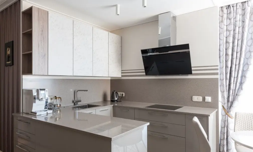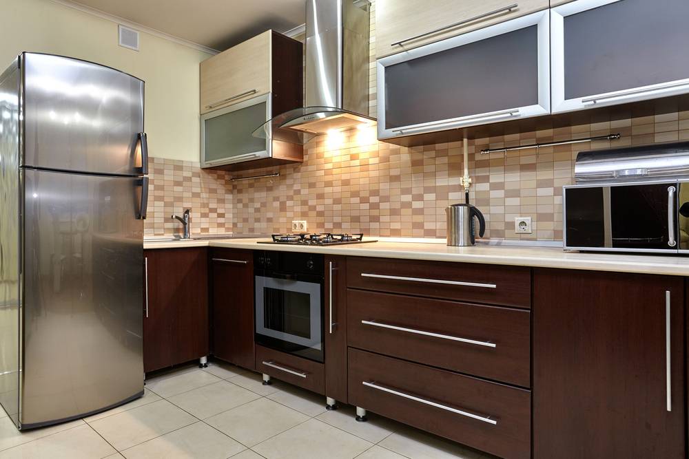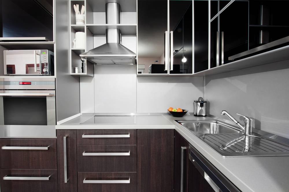 Сразу стоит сказать, что для современной кухни, особенно с небольшой площадью, лучше выбирать бытовую технику встроенного типа. Если в квартире проживает 1-2 человека и есть мультиварка, то можно установить врезную, электрическую или газовую, варочную панель на две конфорки. Духовой шкаф можно вынести наверх между столешницей и навесным модулем. Так освободится место для хранения в тумбе под варочной поверхностью.