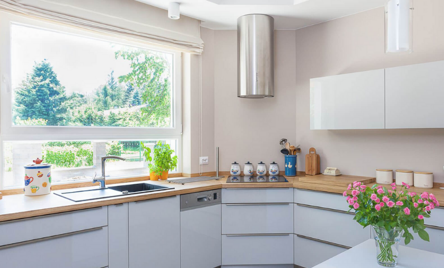 Если же в планах посудомоечной машины нет, то можно перенести мойку к окну. В этом случае уже придется заниматься удлинением труб, что достаточно непросто: придется поднимать их угол либо же покупать насос, который стоит недешево. Но зато такое действие освободит рабочее пространство, и при мытье посуды можно будет любоваться пейзажем за окном, а не просто смотреть в стенку.