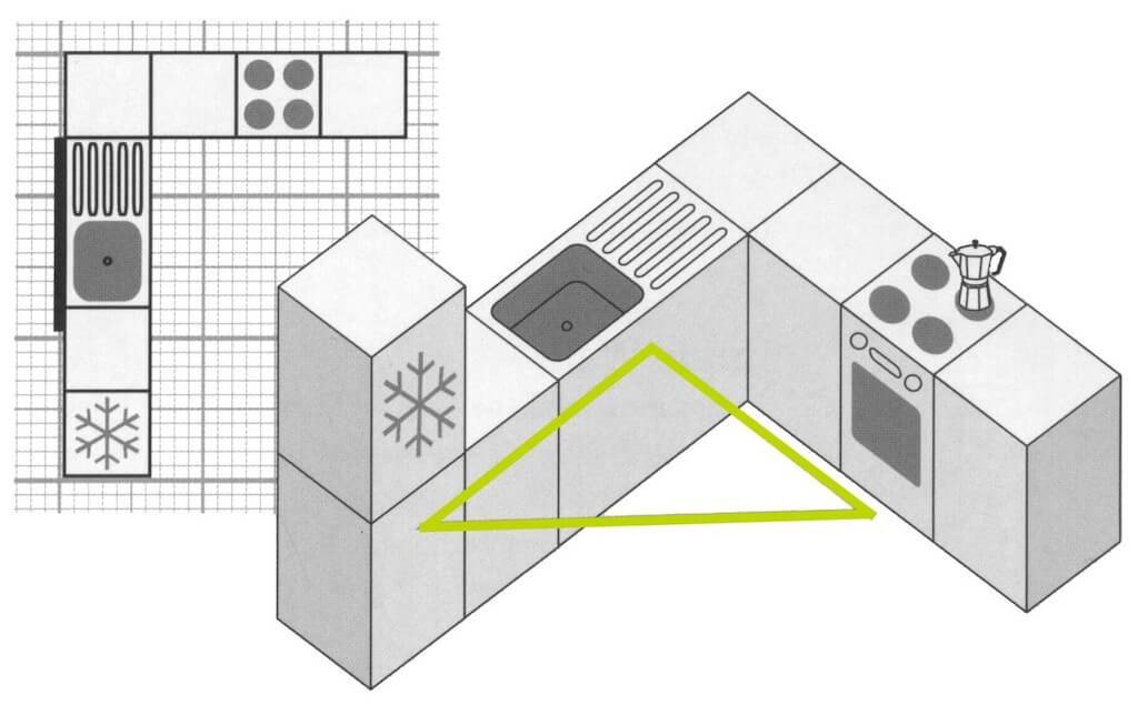 Рабочий треугольник не должен быть большим, поскольку в процессе приготовления еды это принесет неудобства: трудно следить за тем, что творится на плите; придется делать «ненужные» шаги, удлиняя время приготовления блюда.