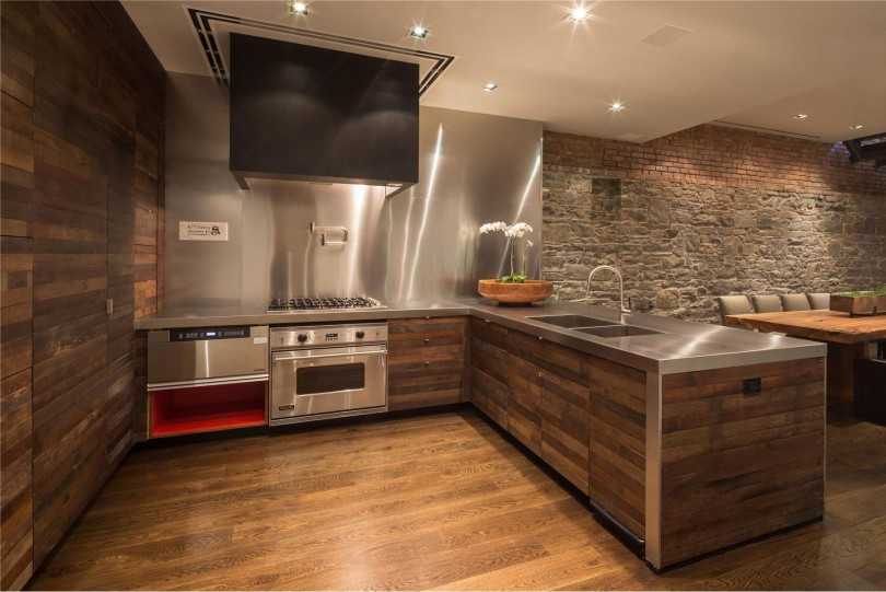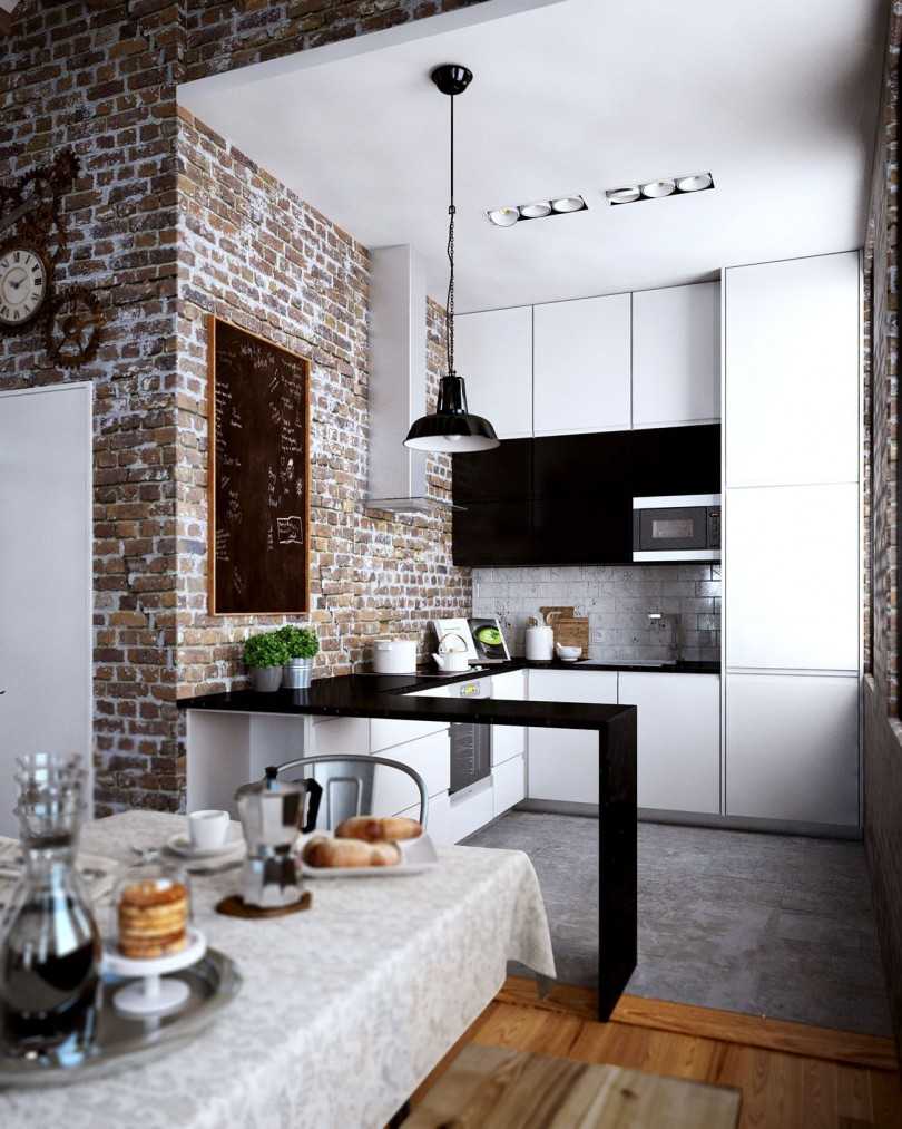 - Кухня в стиле лофт смотрится оригинально. Стены в таком помещении выполнены в виде кирпичной кладки. Выбирается минимальное количество мебели и бытовой техники.