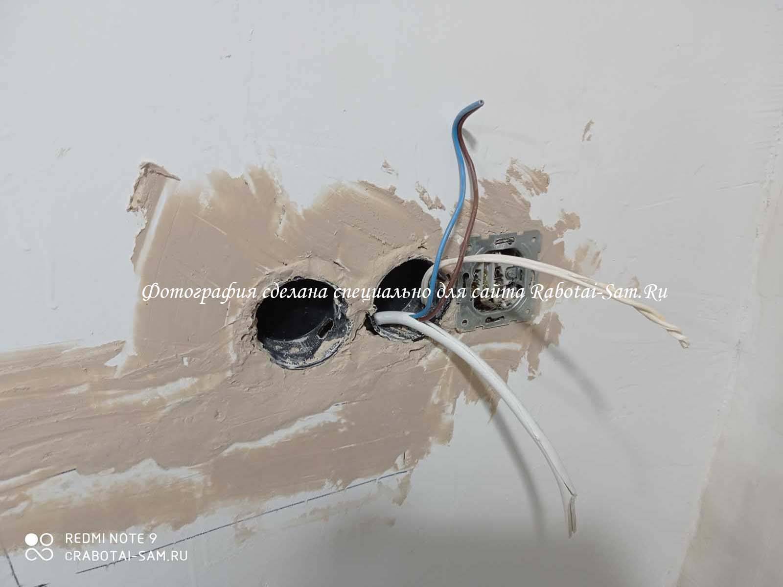 ШАГ 1: штробление стен + новая проводка. Делая ремонт кухни своими руками, мы позаботились о замене всей проводки. Потолочную проводку мы уже меняли. Теперь необходимо поменять проводку для всех розеток. От распределительной коробки штробим стену до места новой розетки, затем специальной коронкой на перфоратор проделываем круглое отверстие под коробку розетки. Затем необходимо проложить новый кабель и зашпаклевать проштробленную под проводку полосу. Подключаем кабель к распределительной коробке и переходим к следующему этапу.