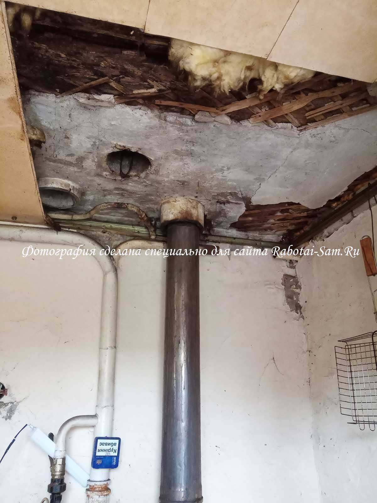 Потолок в кухне предстоит переделывать полностью. Его состояние оставляет желать лучшего. Вся отделка начала отваливаться до деревянного перекрытия. Было решено изготавливать новый пластиковый потолок на кухне своими руками. Это было самым бюджетным и оптимальным решением, которое мы решили воплотить в реальность. В план косметического ремонта кухни своими руками пластиковый потолок отлично вписался.