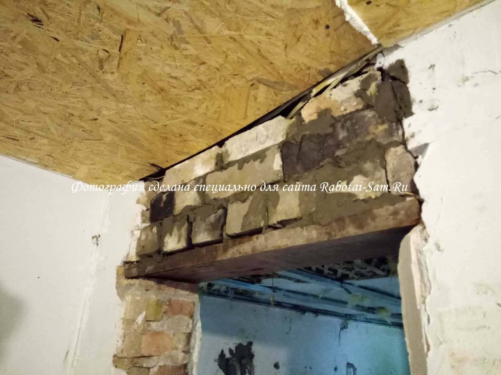 ШАГ 4: ремонт стены. Бонусом к строительству простенка нам пришлось отремонтировать стену над дверью. Используя все те же материалы, мы заложили стену над дверью в кухне, предварительно установив деревянное перекрытие.