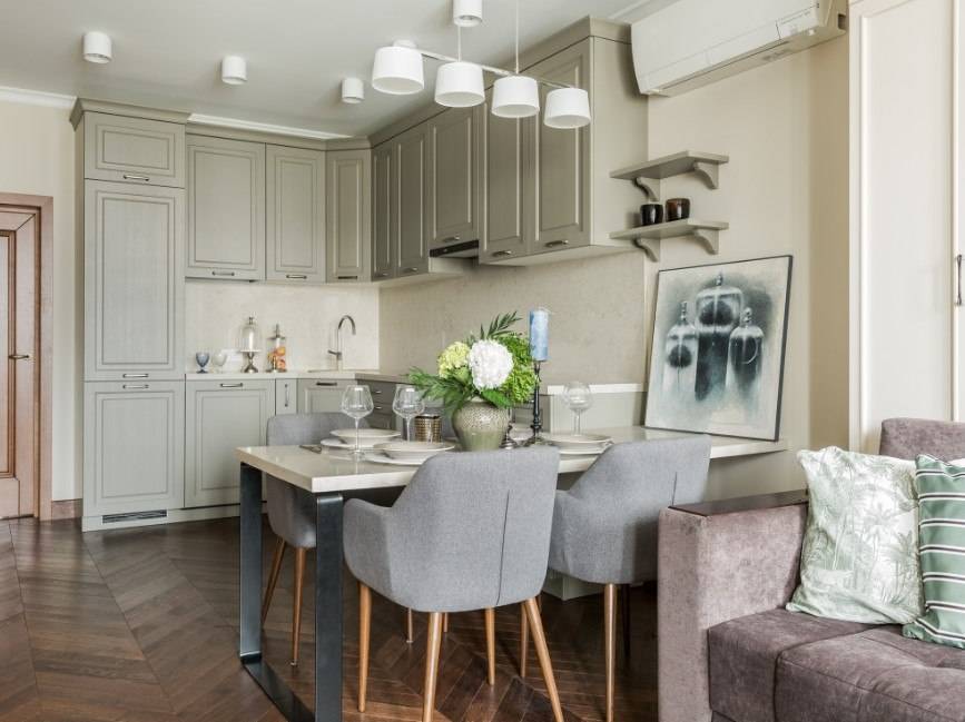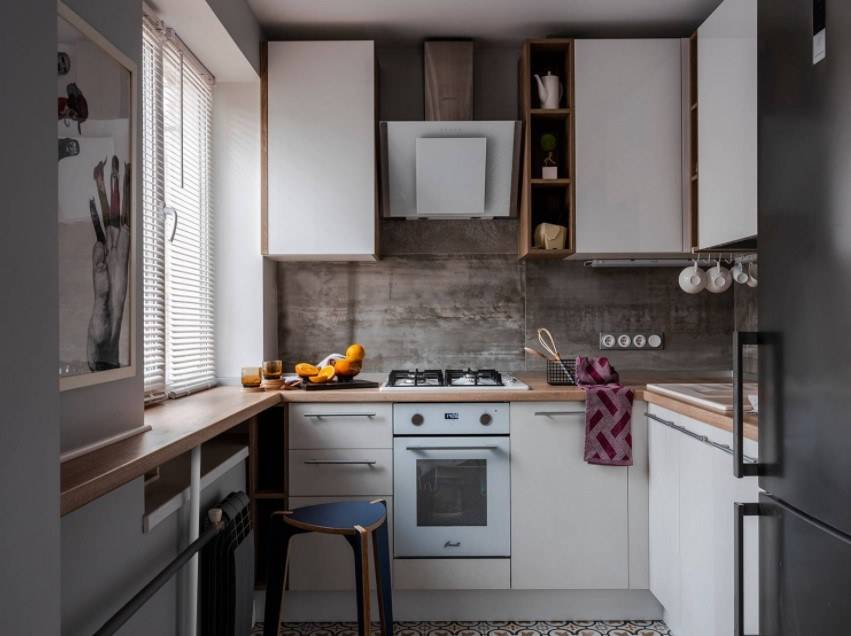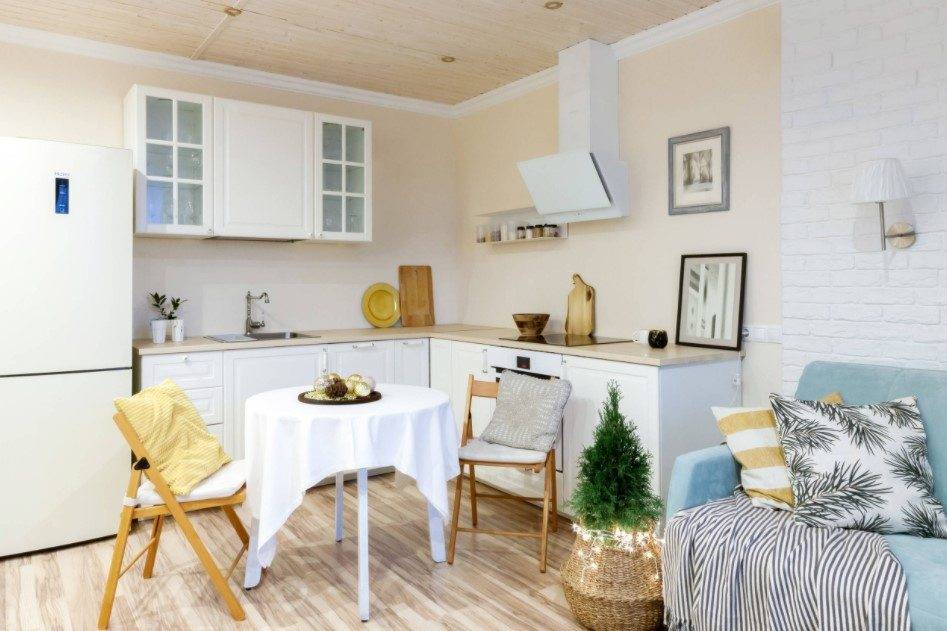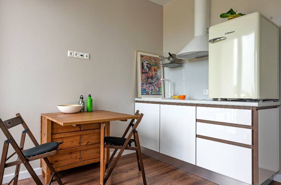 Один из главных моментов в ремонте кухни своими руками в обычной хрущевке – это сложная, но выполнимая задача по расширению пространства маленькой комнаты. В данном случае помогут популярные дизайнерские хитрости: светлые цвета и оттенки в отделке потолка, стен и пола, качественное и яркое освещение, выбор компактной кухонной мебели, в том числе, столов-трансформеров, складывающихся стульев. Если это возможно, сделать перепланировку, соединив кухню с соседней комнатой. И конечно, строгий отбор только самой необходимой компактной мелкой и крупной бытовой техники для кухни.
