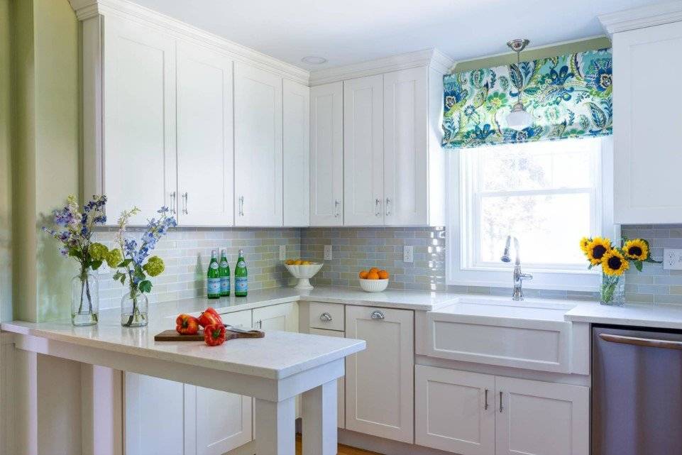 все чаще кухонные помещения оборудуются большими, открытыми окнами с короткими шторами;