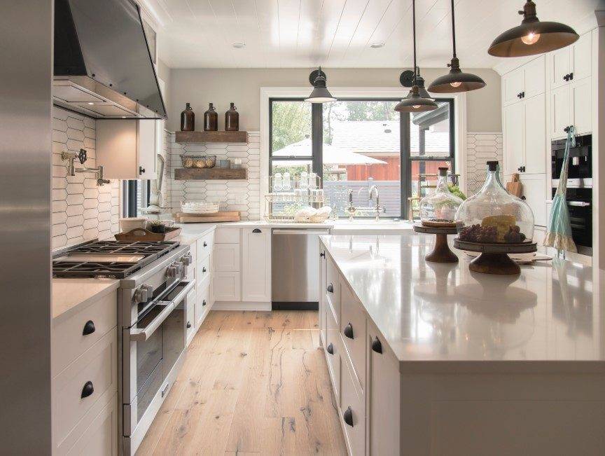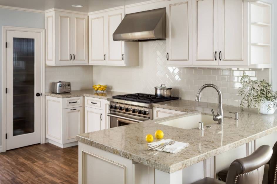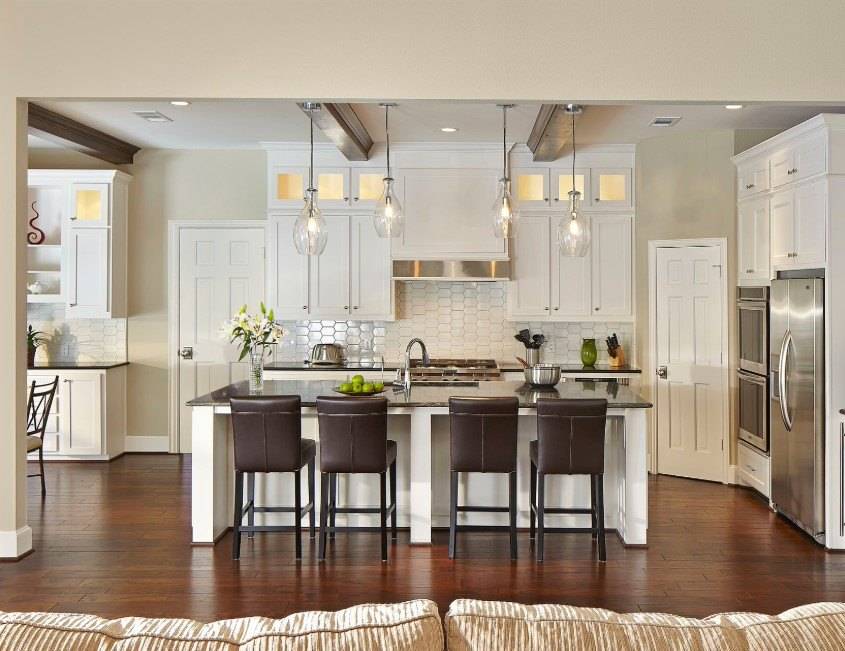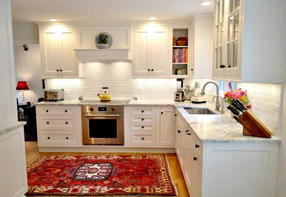 Неплохо смотрится кухня в светлых тонах с кафелем вокруг рабочей зоны, поскольку он прекрасно отмывается, на нем не остаются пятна. Раковина может находиться возле окна, когда весь гарнитур выстроен в П-образной форме. Плита и вытяжка стоят посередине. Добавление большого острова обеспечивает дополнительное пространство. Можно использовать зону в качестве обеденной или рабочей, а внизу поставить ящики для хранения утвари. На задней стороне острова находится мусорный бак.