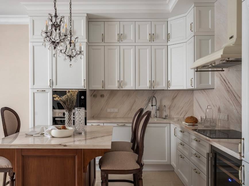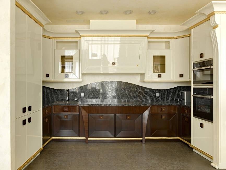 Ваша кухня сияет элегантностью французского стиля? Сделайте фасады мебели светлыми, в идеале – белыми, и украсьте их инкрустациями из золота и серебра. Все необходимое для этого вы без труда отыщете в строительных магазинах.