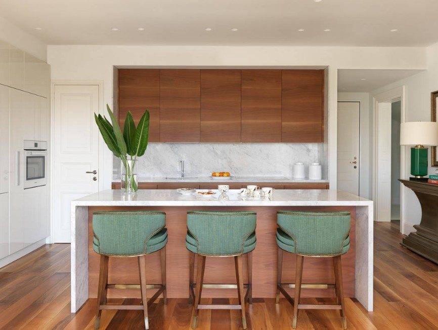 Можно сделать кухню в стиле минимализма, использовав в качестве основного цвета для гарнитура коричневый. Мебель устанавливается линейно, напротив монтируется длинный остров с раковиной, с одной его стороны ставятся стулья, поскольку это же и обеденная зона. Пол, стены и потолок могут быть кристально-белыми. Максимум, что на окнах – жалюзи.