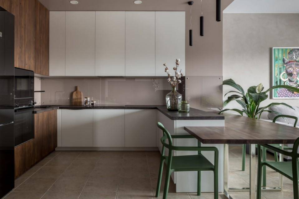 Тем, кто предпочитает более темные оттенки, обязательно должна понравиться кухня, где гарнитур черный глянцевый, рабочая поверхность белая. Форма мебели П-образная, раковина установлена на острове, а позади него стоит дополнительно барная стойка со стульями, изготовленная в цвете натуральной древесины.