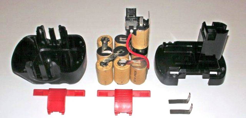Внутри аккумулятор шуруповерт устроен очень просто. Аккумуляторные банки соединены последовательно между собой металлической фольгой с помощью точечной сварки. В простейшем случае все заканчивается скользящими контактами.