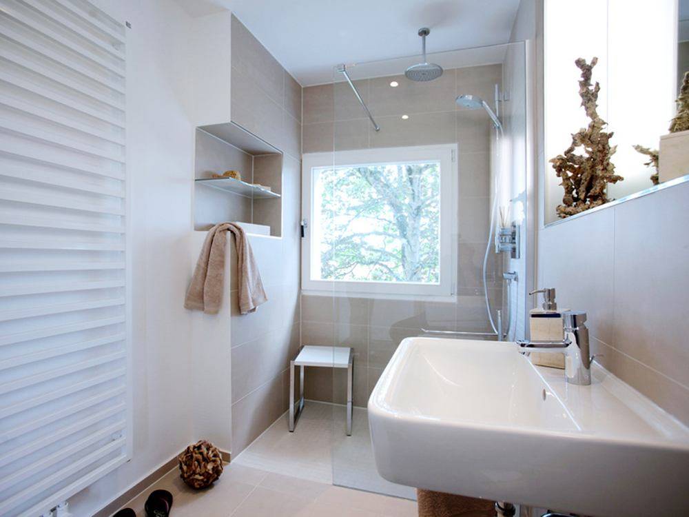 В больших ванных комнатах имеет смысл визуально разделять отдельные зоны. В малых помещениях лучше подчеркнуть единство пространства. Мебель, размещенная по всему помещению в длинных, узких ваннах, а также использование разных расцветок, имеют форму оптических барьеров. Вместо этого лучше обустроить ванную комнату равномерно.