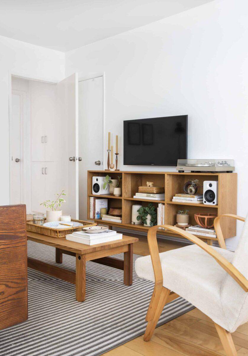 Стандартная гостиная включает в себя комфортный диван, телевизор, минимум корпусной мебели для хранения мелких вещей. Но в зависимости от площади квартиры, наличия в ней кладовых и гардеробных, просторных спален и детских в зале для приема гостей также могут присутствовать шкафы во всю стену, дополнительные комоды и другие предметы.