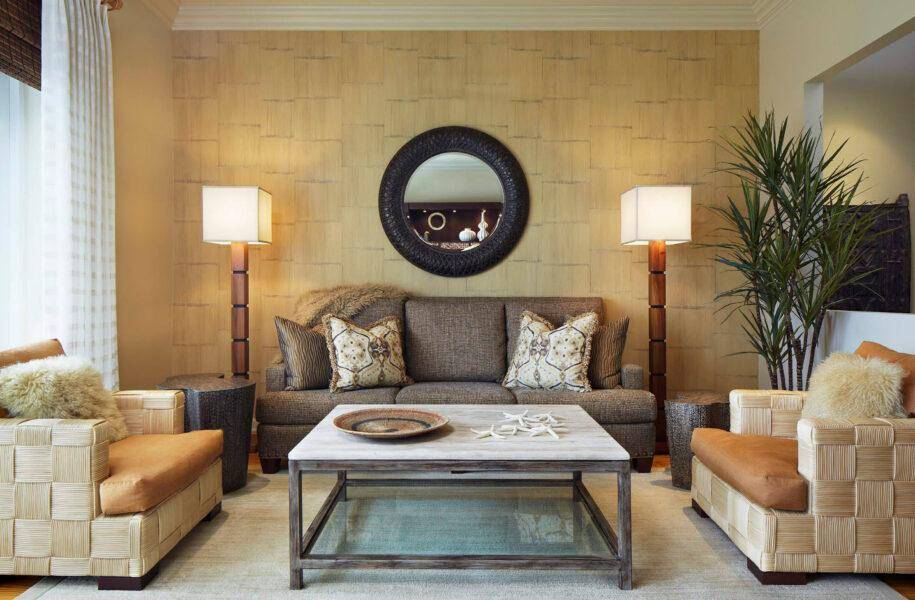 Деревенский стиль создает романтическое настроение. Комната оформлена в пастельных тонах. В отделке предпочтительно дерево (дощатый пол, деревянная паркетная доска), плетеная мебель и коврики из соломки, камень или имитация.