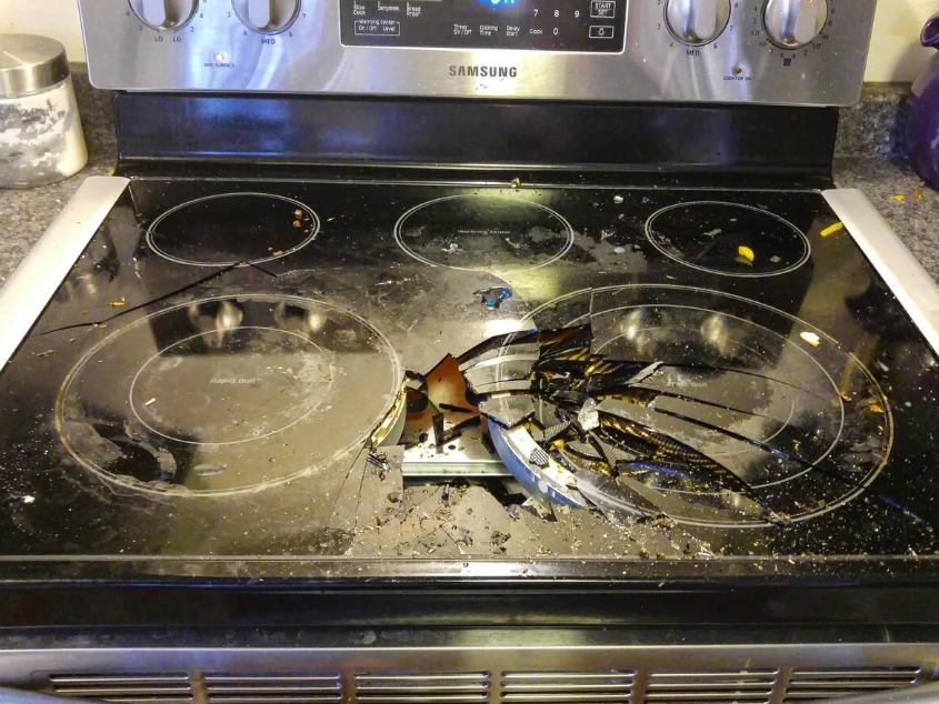 Если лопнуло стекло варочной поверхности, по характеру повреждения можно установить причину: