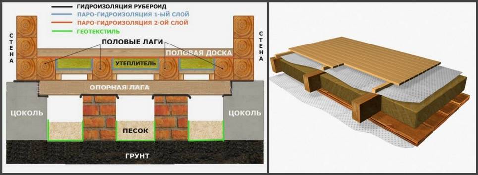 Для деревянного дома подойдет либо бетонный, либо дощатый пол. Второй вариант состоит из следующих слоев: