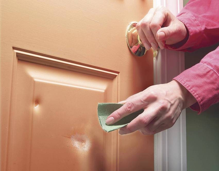 После того как все слои старой краски удалены, следует взять наждачную бумагу, закрепить ее на держателе и старательно отшлифовать дверь, совершая движения по линии волокон. Эта мера позволит удалить краску из труднодоступных участков, сгладить царапины и сколы.