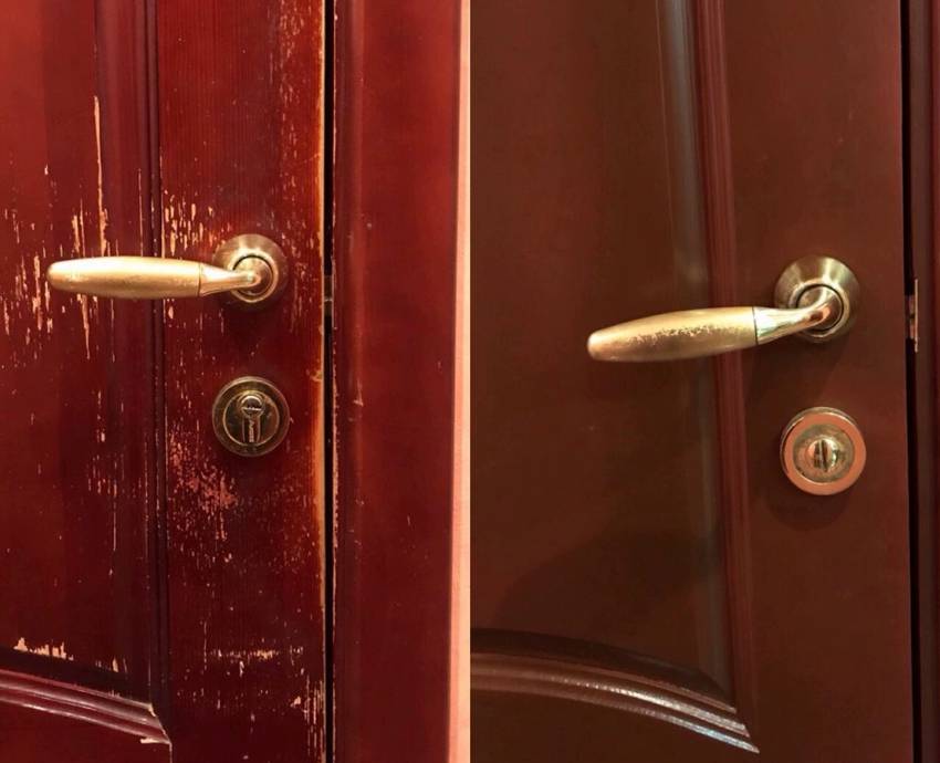 Шпонированные двери при грамотном уходе за ними будут служить не один десяток лет. Только и в данном случае от незначительных царапинок и дефектов им не защититься. Следовательно, необходимо иметь понятие, как реконструировать дверь, облицованную шпоном собственными руками. Осуществить это просто посредством доступных материалов и элементарного инструментария.