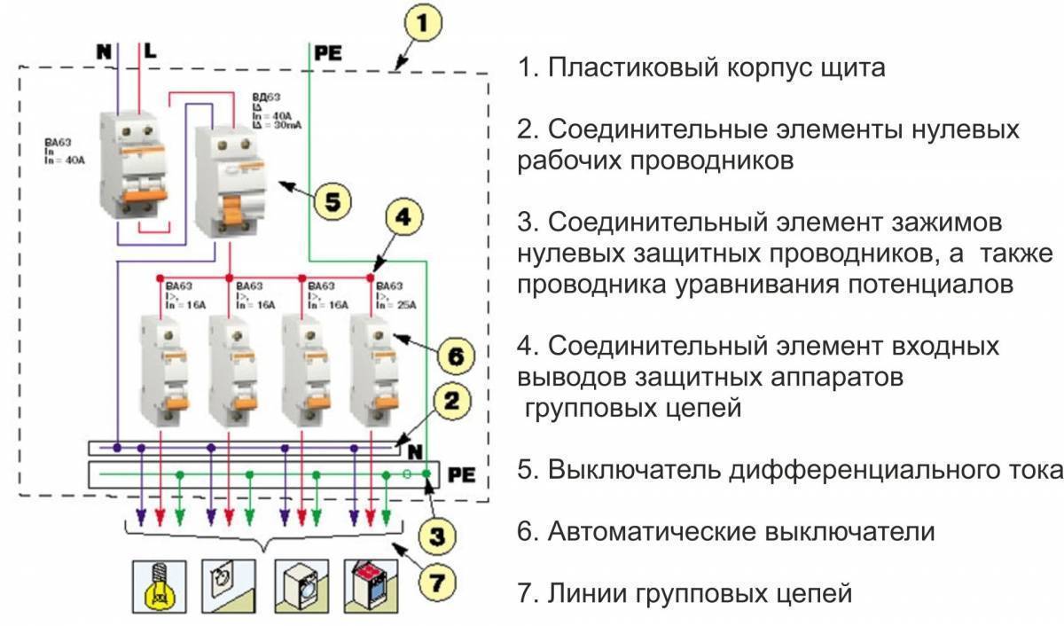 В установленном щитке шина РЕ выполнят задачи главной заземляющей шины. К ней должны быть подключены все повторные заземляющие устройства.