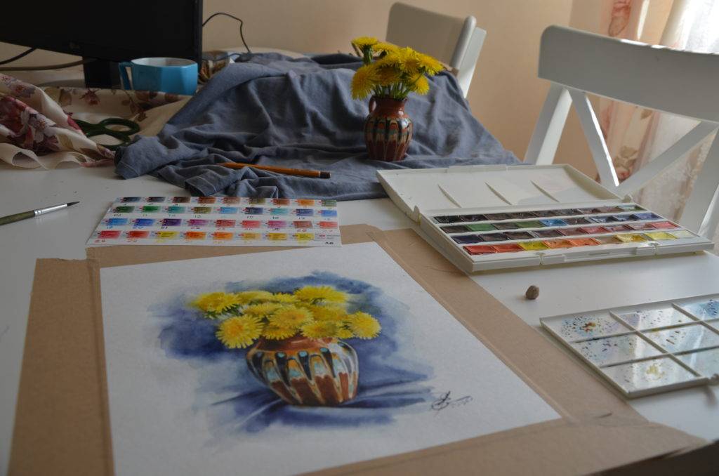 И, столкнувшись с ним, не умея рисовать, можно выполнить прекрасную работу, потому что акварель может сама вас научить, подсказать, что как делать. А можно уметь рисовать, как я, например, но вообще не совладать с этой краской.