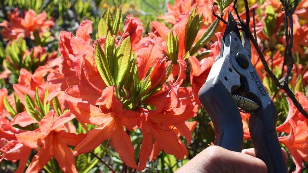 Увядшие соцветия, снижающие декоративность растения, нужно обламывать или осторожно обрезать, сохраняя пазушные почки у верхних листьев. Это способствует обильному росту и цветению рододендронов в следующем году