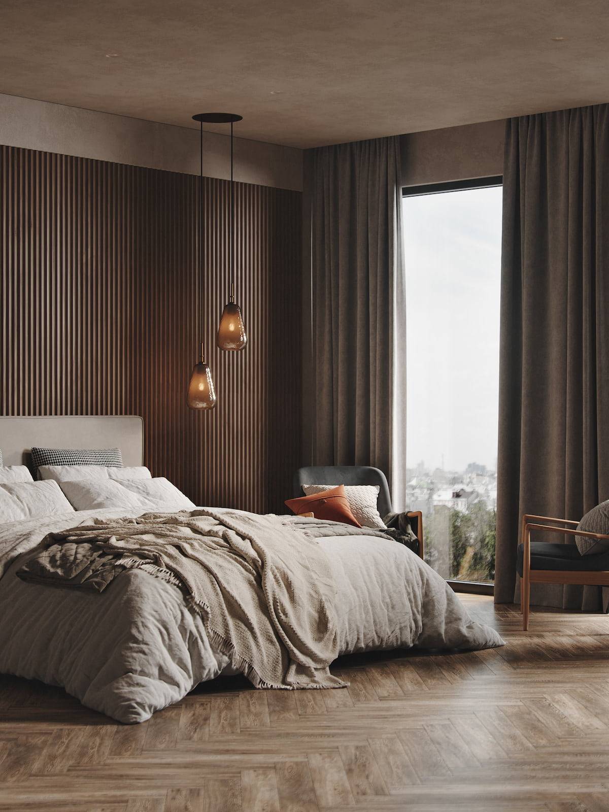 В спальне холостяка, как правило, функциональная составляющая штор важнее её декоративной роли, по этой причине шторы не должны пропускать много света, быть плотными, защищать от любопытных взглядов. Тип штор может быть любым.