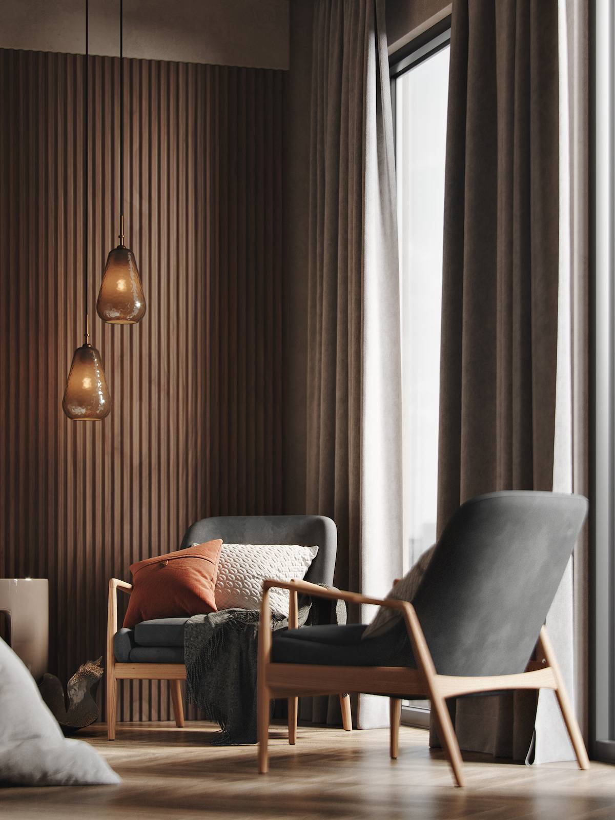 Тёмные шторы сделают комнату мрачно — торжественной.