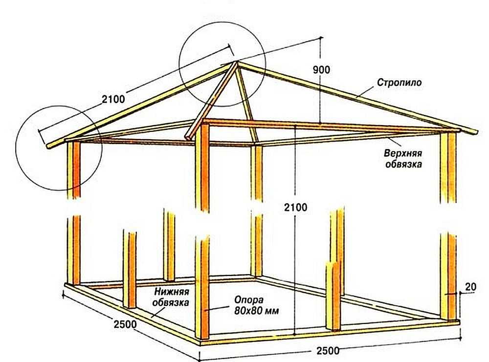 Пошаговая инструкция в схемах по созданию двускатной крыши для квадратной беседки.