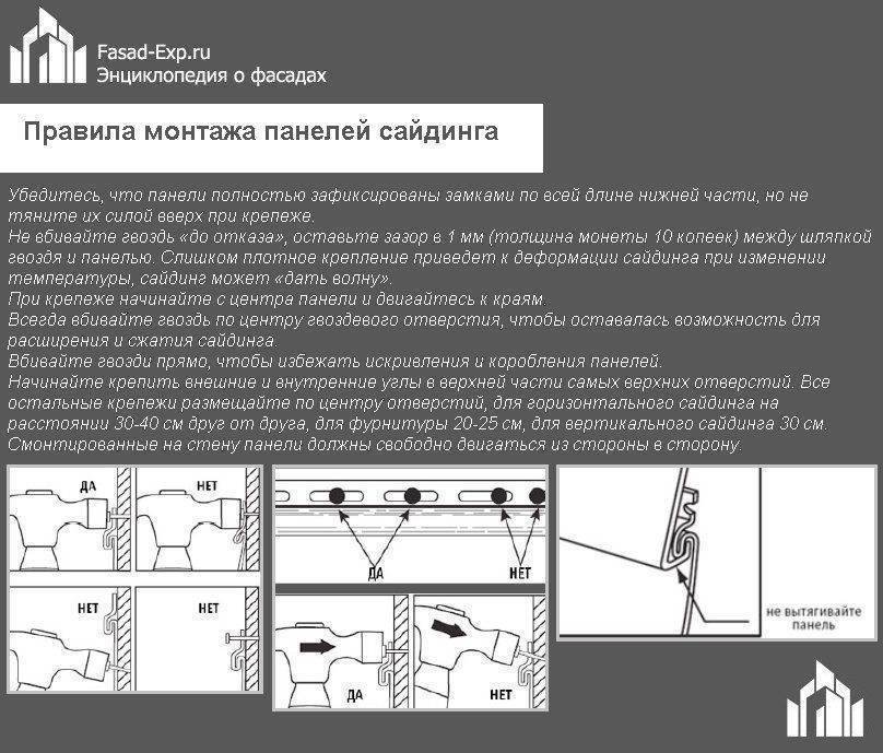 Монтаж панелей сайдинга выполняется снизу вверх, листы крепятся к направляющим