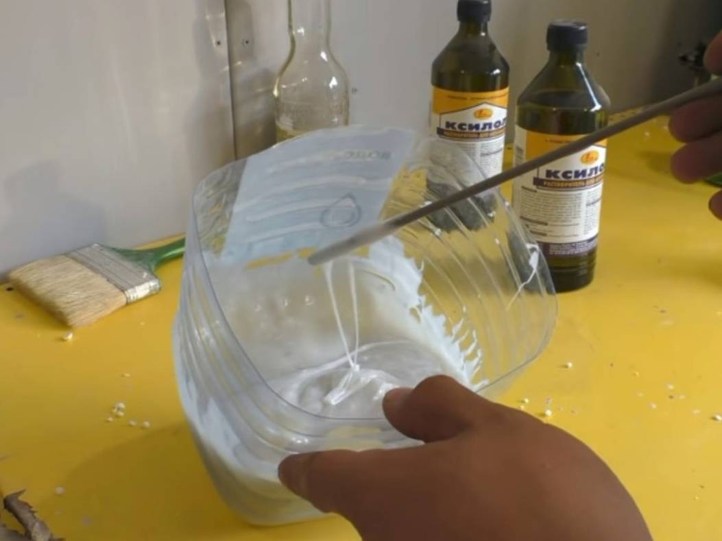 Полистирол начнет растворяться в жидкости практически сразу, от него останется только вязкая масса. Можно продолжать добавлять крошки, чтобы изготовить большой объем клея. Также из раствора разрешается взять вязкую массу и использовать ее по назначению.