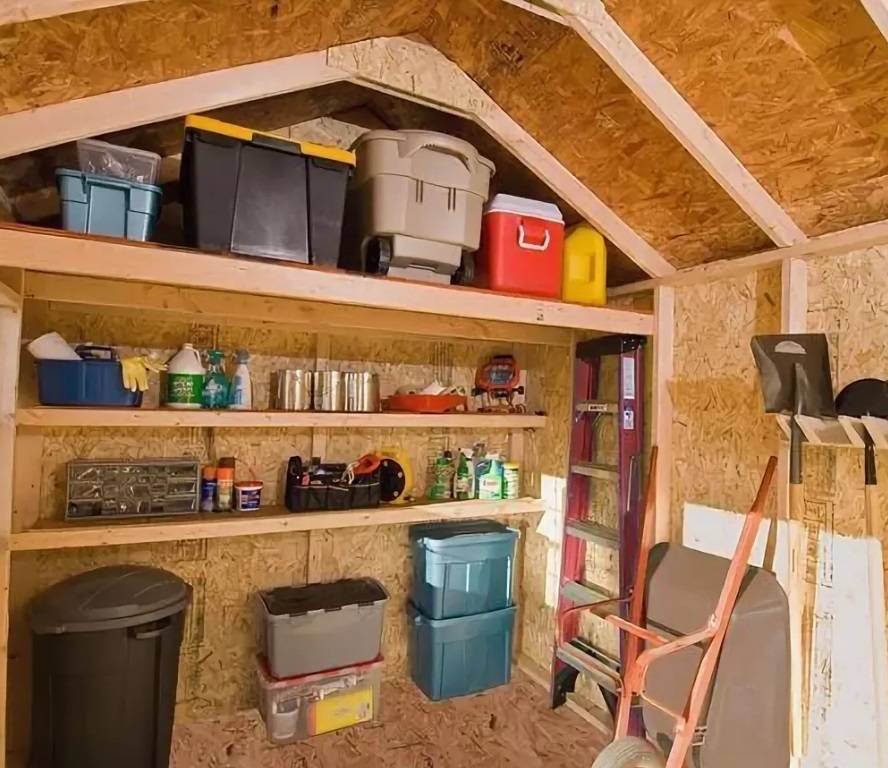 Стоит сразу же позаботиться о внутреннем обустройстве сарая – например, сделать удобные держатели для садового инструмента, организовать полки и прочее.